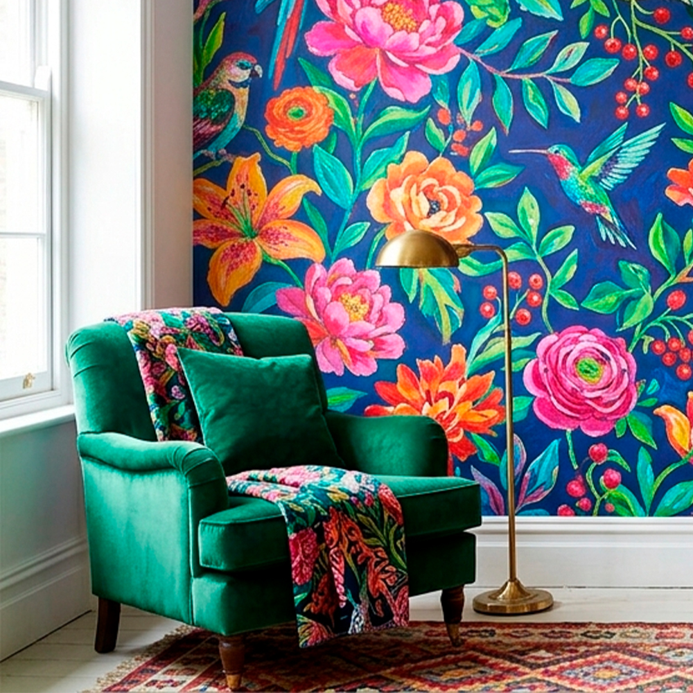 Nature motifs have never gone away, but 2026 takes them bigger, bolder, and more expressive. We are talking about florals that fill the entire repeat, botanicals rendered with drama and confidence rather than delicate restraint. This is less “pretty wildflower meadow” and more “the garden taking over.” Rich, jewel-toned palettes, exaggerated scale, a sense of lushness that borders on the theatrical.