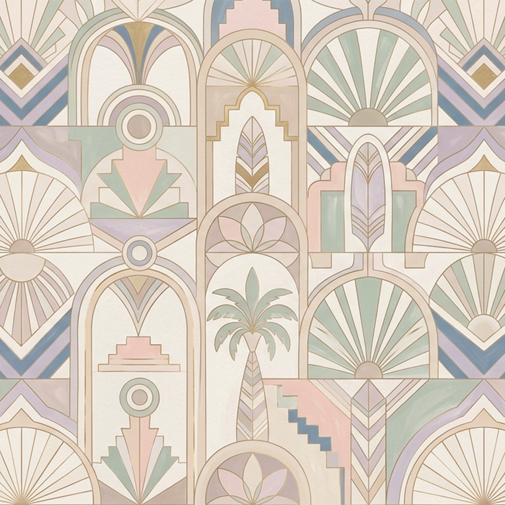 Art Deco has always had a presence in surface design, but 2026 sees it reimagined with contemporary colour and a slightly more playful energy. Clean lines, symmetry, bold graphic shapes, arches and fans and geometric repeats — but freed from the formality of historical Deco and brought into something that feels fresh and almost architectural. This is showing up in interior tiles, wallpaper, and print design with increasing frequency.