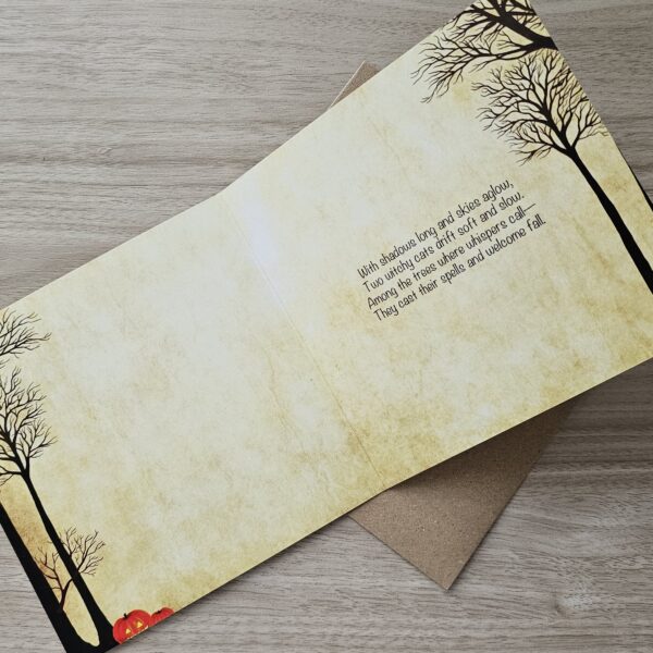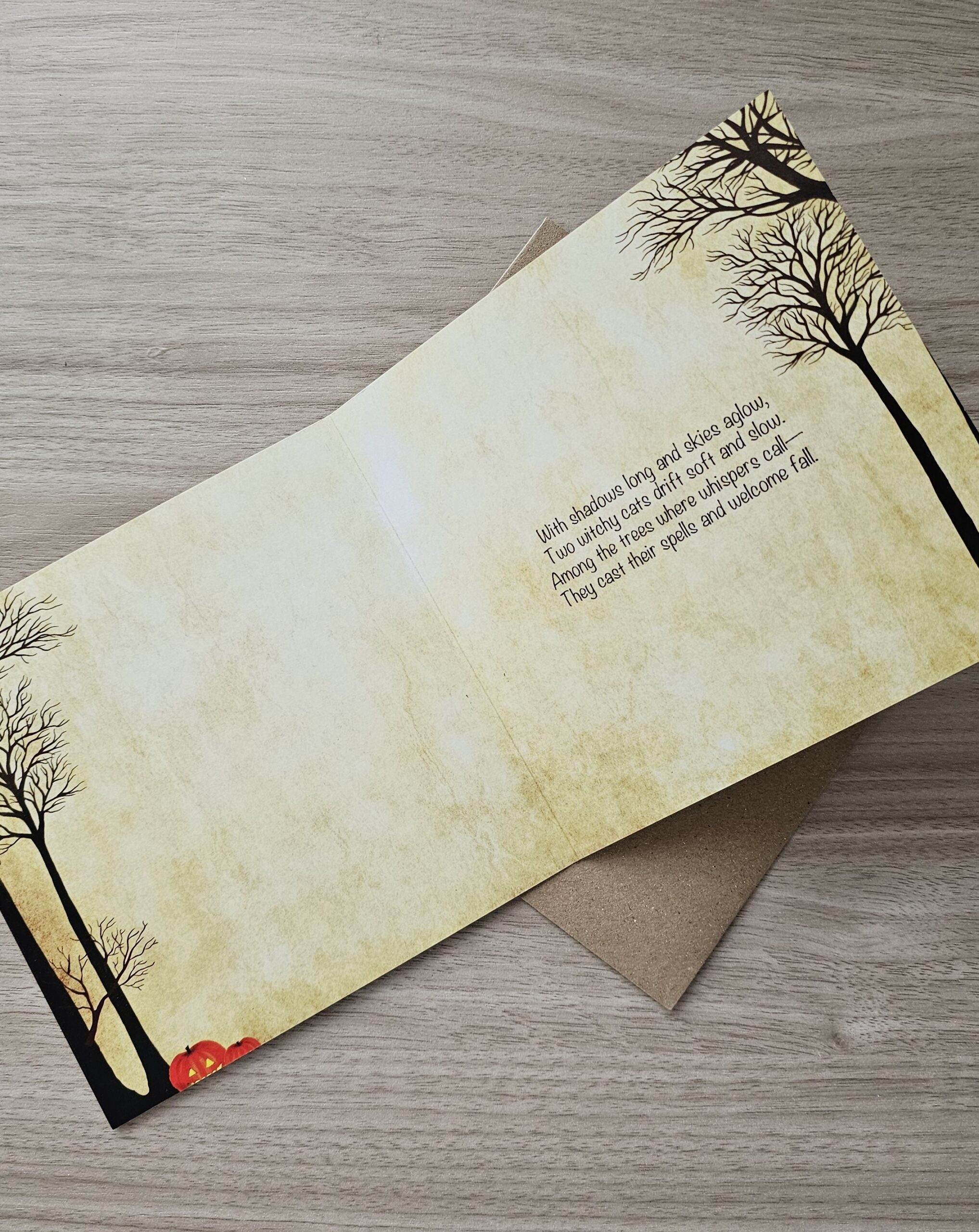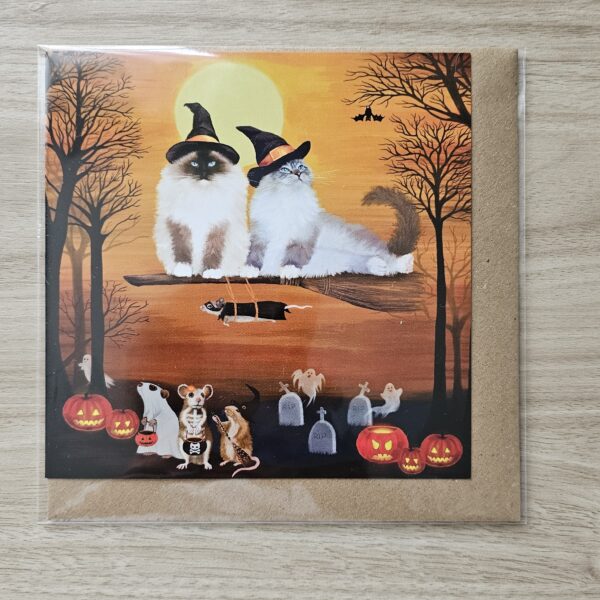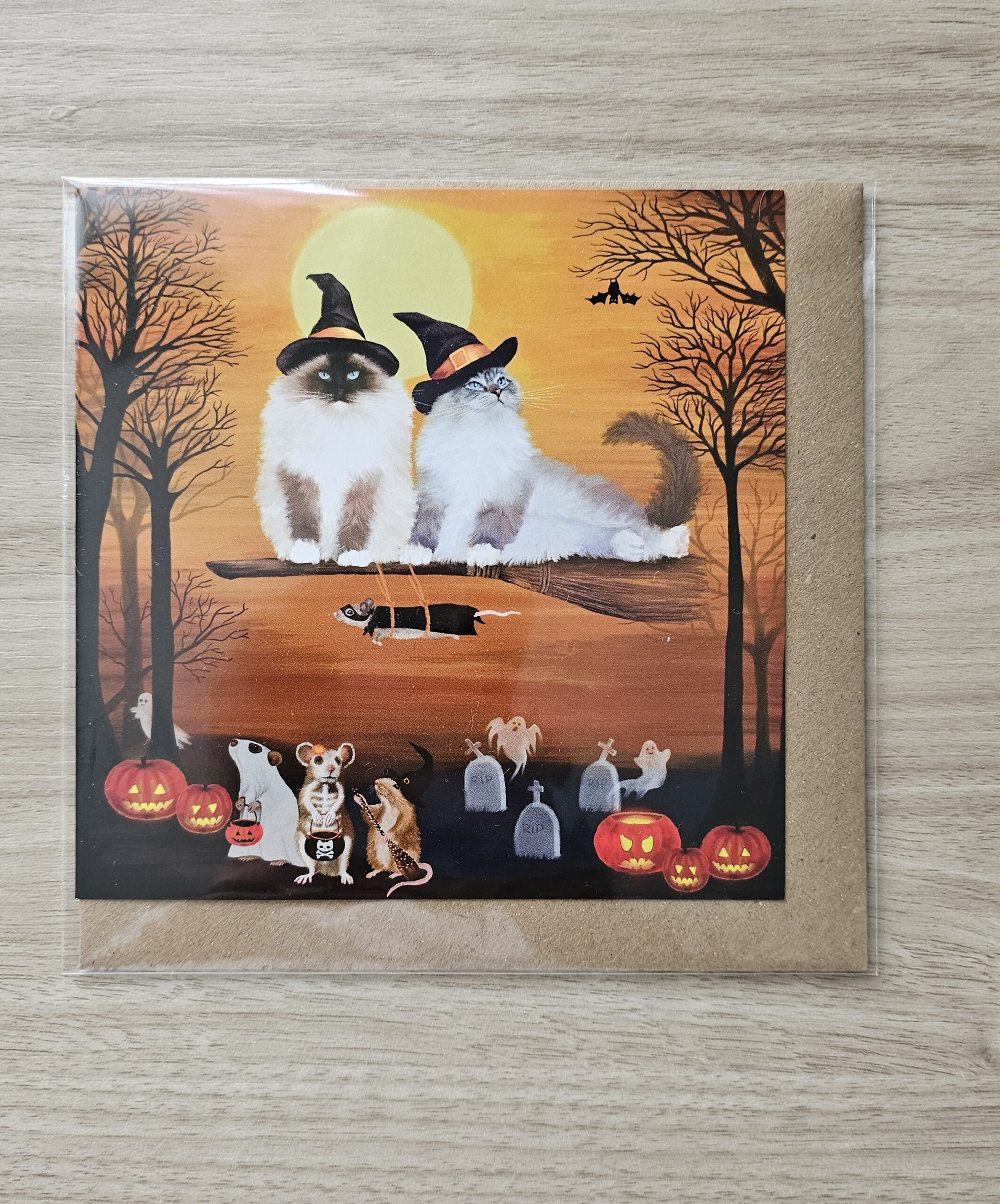 These adorable furballs are ready to do some haunting – with cuteness of course – while their little mouse friends are on their way to trick or treat. With all the adorable details this card is sure to delight cat lovers and Halloween enthusiasts alike!