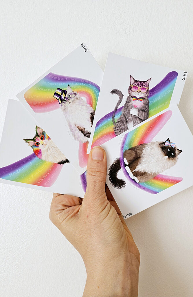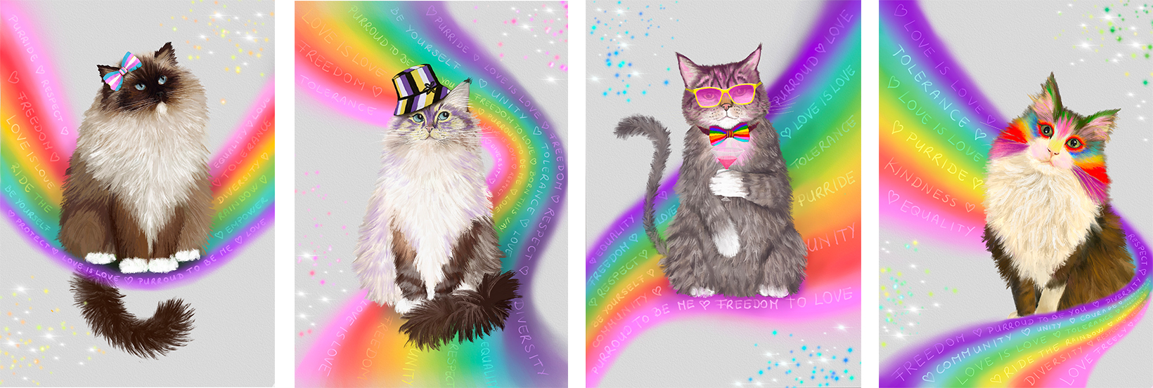 Each rainbow cat in the collection has its own personality — and they were modeled by real cats in my life.